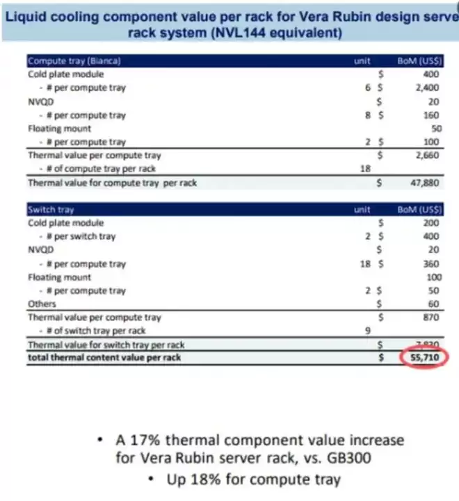 有数据表明,下一代Vera Rubin NVL144平台的散热总价将更高。随着计算托架和交换机托架的冷却需求进一步增加,预计每个机柜的冷却组件总价值将增长17%,达到约55710美元(约合人民币近40万元),其中为交换机托架设计的冷却模块预计价值将显著增长67%。