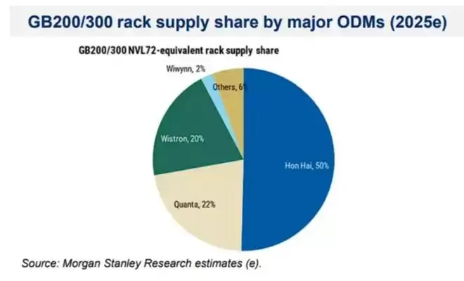 从2025年度GB200、GB300机架服务器各ODM厂出货的市场占比来看,鸿海占过半的市场份额,高达52%;纬创约占 21%;广达占约 19%;就产品别来看,GB200占比高达81%,GB300则约 19%。