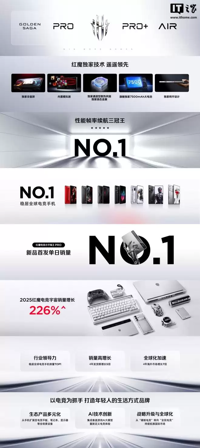 值得一提的是,在今年10月的红魔游戏手机新品发布会上,中兴通讯终端事业部总裁、努比亚技术有限公司总裁倪飞曾公布一组亮眼数据:2025年,红魔电竞宇宙销量实现了226%的惊人增长;红魔电竞平板3 Pro新品在首发当日便夺得销量冠军;此外,红魔游戏手机持续稳居全球电竞手机销量榜首。