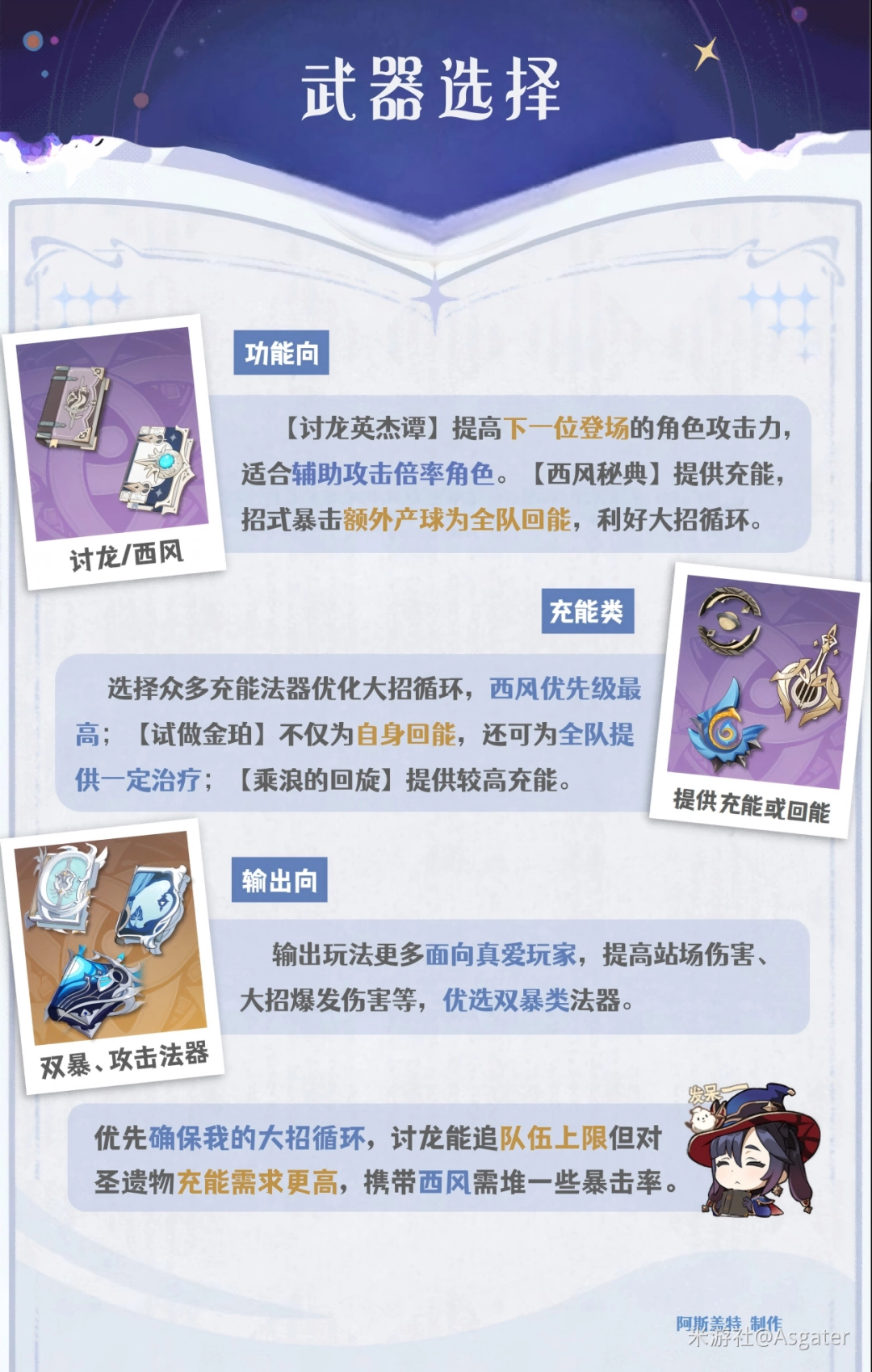 ①【逃龙的英杰谭】这把武器非常适合依赖攻击倍率的辅助角色,但它对圣遗物的充能要求较高(通常需要270%甚至更高),一般建议在莫娜达到双水共鸣的后台配置时再考虑选用。