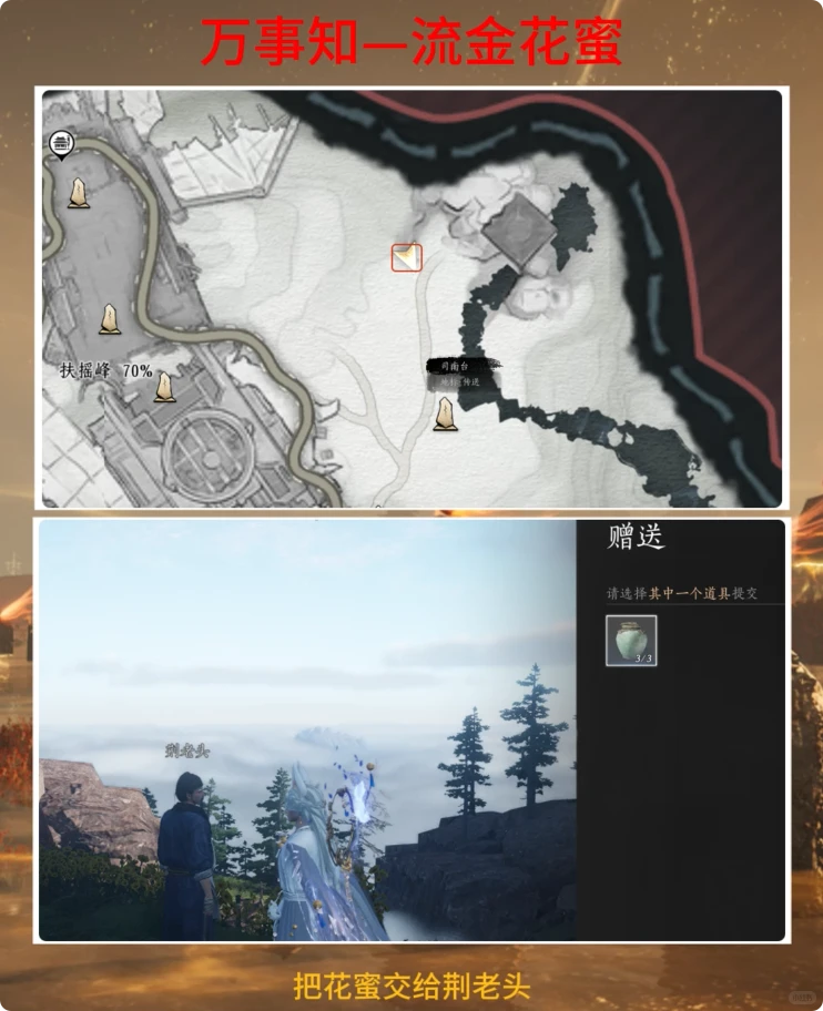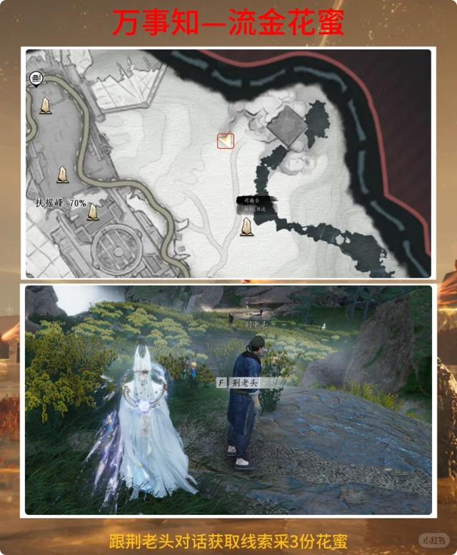 首先,与荆老头对话,领取收集3份花蜜的线索