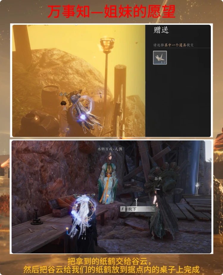 把拿到的纸鹤交给谷云,然后她会给你一只纸鹤。最后,将这只纸鹤放置在据点内的桌子上,即可完成任务。