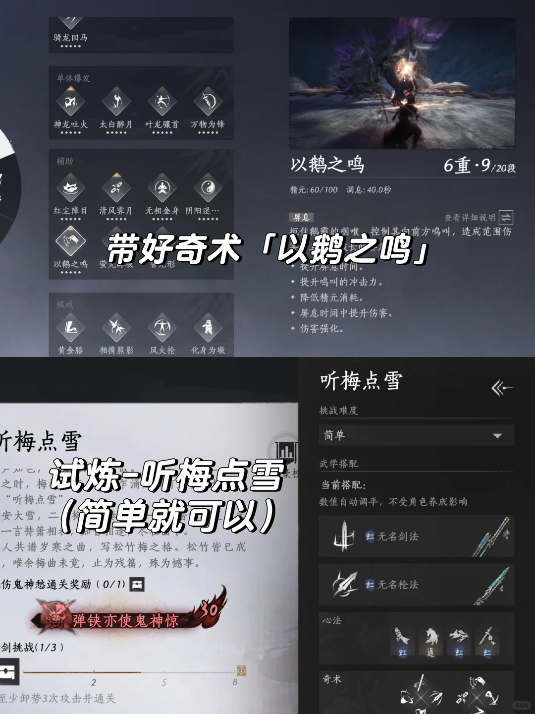 首先,你需要掌握奇术【鹅吼正声】,随后前往试炼地点“听梅点雪”(完成流程非常简单)。