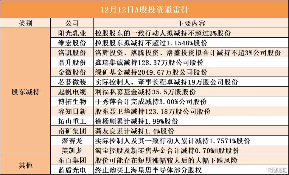阳光乳业控股股东及一致行动人计划减持不超过3%的公司股份;维宏股份控股股东拟减持不超过1.1548%的股份;洛凯股份股东洛辉投资、洛腾投资、洛盛投资拟合计减持不超过3%的公司股份;芯片微装实际控制人、董事长程卓拟减持19万股公司股份;聚赛龙实际控制人及其一致行动人累计减持1.7571%股份;美凯龙股东淘宝控股及新零售基金合计减持0.70%的H股股份;蓝盾光电终止购买上海星思半导体部分股权
