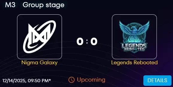 Paper Tigers的首战将于12月14日14:00打响,将迎战E7战队;Legends Rebooted则将于12月14日21:50展开与Nigma Galaxy的较量。这支由W33、ContRoL、奇迹哥领衔的老牌Nigma战队实力同样强劲,精彩对决不容错过!