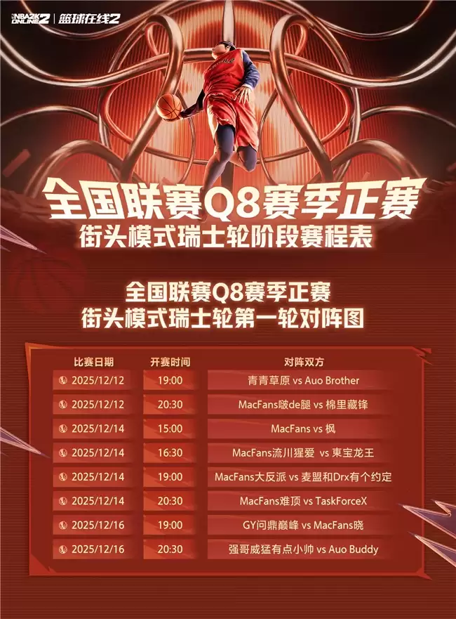 各位MVP,准备好了吗?备受瞩目的NBA2KOL2全国联赛Q8赛季正赛,将于12月11日正式拉开大幕!历经此前赛事的层层选拔,顶尖选手与战队已齐聚一堂。同时,本届赛事赛制全新升级,采用“瑞士轮”与“淘汰赛”相结合,通过多轮公平竞技,最终将角逐出2名顶尖选手与2支精英战队,晋级1月底在北京举行的线下总决赛!王朝与街头,双线并进,谁将问鼎全国之巅?悬念即将揭晓!