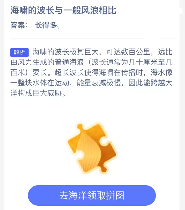 支付宝神奇海洋今日答案:海啸波长比普通风浪长多少?