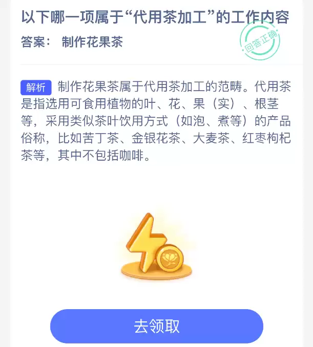 支付宝蚂蚁新村答题:代用茶的加工包含哪些工作?