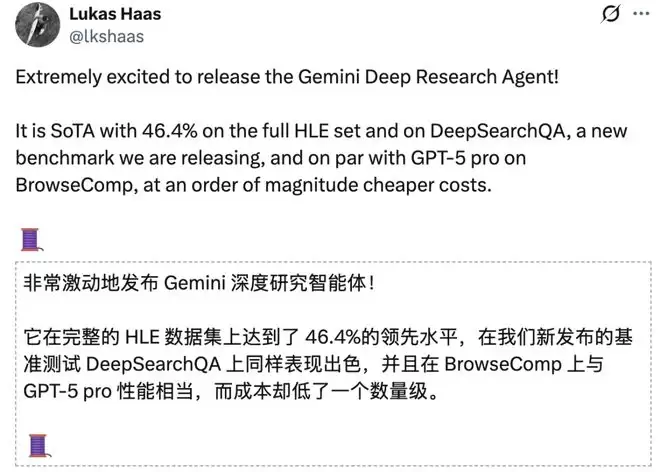 最新版Gemini Deep Research Agent在谷歌新基准测试上得分46.4%,在BrowseComp上与GPT-5 Pro相当,价格却低了一个数量级。