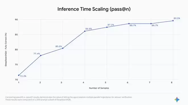 在内部评估中,谷歌发现当允许智能体执行更多搜索和推理步骤时,其性能获得显著提升。