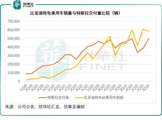 在过去两年,大家总将比亚迪与特斯拉(TSLA.US)相提并论,因为从新能源汽车尤其纯电汽车的交付量来看,两家车企的差距正在缩小。见下图,比亚迪的纯电乘用车销量已成功超越特斯拉,且差距在扩大。