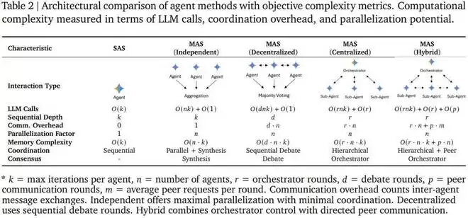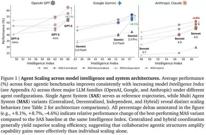 利用五种典型的智能体架构(单智能体系统以及四种多智能体系统:独立型、中心化、去中心化、混合型),并在三个 LLM 家族(OpenAI, Google, Anthropic)中进行实例化,谷歌这个团队对 180 种配置进行了受控评估,标准化了工具、提示结构和 token 预算,以将架构效应从实施混杂因素中隔离出来。