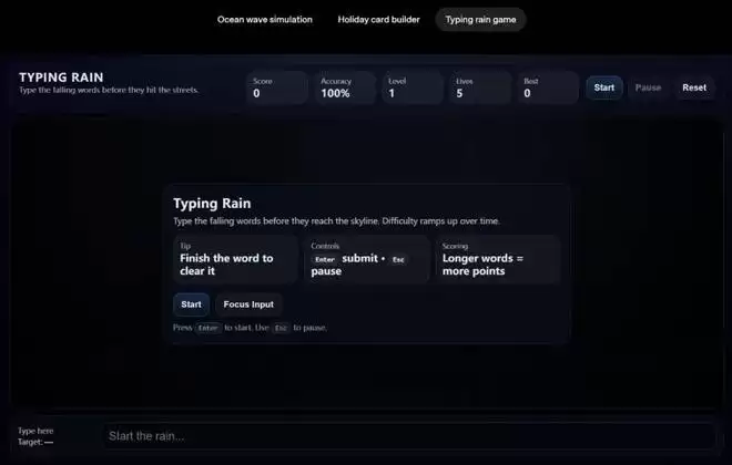 GPT-5.2 Thinking 在前端工程能力上也优于 GPT-5.1 Thinking。早期测试者发现,它在前端开发以及复杂或非常规的 UI 设计(尤其是包含 3D 元素 的界面)方面的能力显著增强,使其成为全栈工程师的强大日常助手。