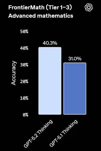 在 FrontierMath (Tier 1–3) 这一专家级数学评估中,GPT-5.2 Thinking 创下了新的 SOTA,解决了 40.3% 的问题。