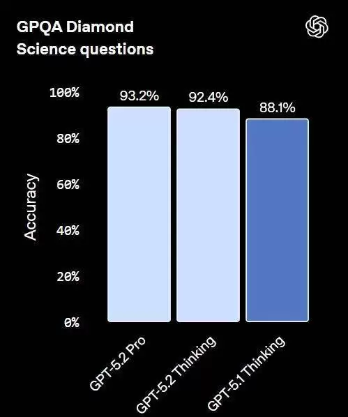 在 GPQA Diamond(一个研究生级别的「防谷歌搜索」问答基准测试)上,GPT-5.2 Pro 达到了 93.2%,GPT-5.2 Thinking 紧随其后,达到了 92.4%。