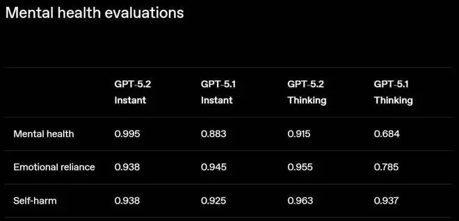 据说在此版本中,研究人员继续致力于增强模型在敏感对话中的响应能力,显著改进了模型对提示自杀或自残迹象、心理健康困扰或对模型的情感依赖等问题的响应。与 GPT-5.1 和 GPT-5 Instant 及 Thinking 模型相比,这些针对性的干预措施显著减少了 GPT-5.2 Instant 和 GPT-5.2 Thinking 模型的不良响应。
