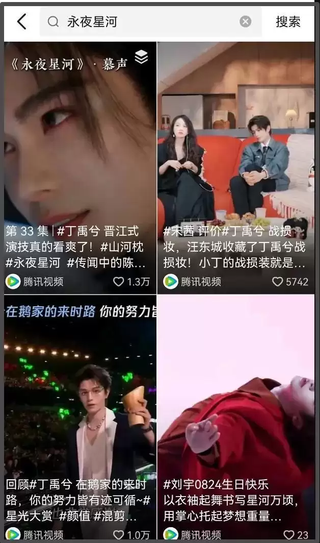 由此可见,该账号要么是删除了虞书欣相关的内容,要么是将内容屏蔽了。哪怕是搜索虞书欣相关作品,比如《永夜星河》,显示的内容也大多都是男主演丁禹兮相关的视频,只要是和虞书欣有关的,不管是单人参加鹅厂活动的视频,还是作品相关的宣传视频,都查无此内容了。