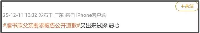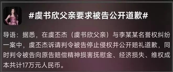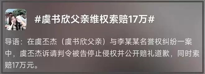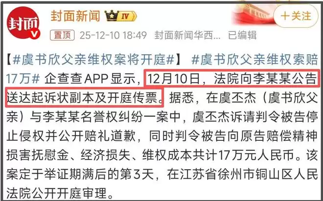 耐人寻味的是,网传空降的日子,也就是10号,虞书欣的爸爸上热搜了,热搜话题分别是“虞书欣父亲维权索赔17万”和“虞书欣父亲要求被告公开道歉”。看话题像是案子审理结束了,其实是案子刚开始,新闻上明明白白地写着“12月10日,法院向李某某公告送达起诉状副本及开庭传票”。