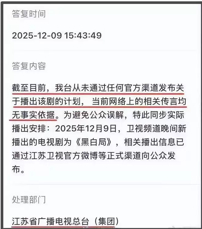 当然,这微妙的时间点还让人联想到了这两天闹得沸沸扬扬的《双轨》空降一事。一开始,是有博主爆料称《双轨》会在12月9号上星江苏卫视。可是到了9号却没出现,反而等到了江苏卫视对此事的回复,其表示“我台从未通过任何最新渠道发布关于播出该剧的计划,当前网络上的相关传言均无事实依据”,态度强硬地撇清了关系。