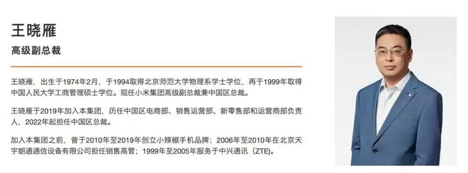 2025年7月,王晓雁升任高级副总裁(SVP)。近年,王晓雁主要负责小米之家等线下渠道的管理。