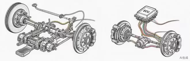 左为传统制动系统,右为EMB线控制动(图片由AI生成,仅供示意)