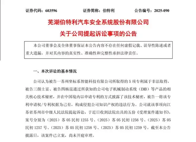 11月21日,芜湖伯特利汽车安全系统股份有限公司(以下称“伯特利”)发布公告,其作为原告,已向苏州坐标系智能科技有限公司(以下称“坐标系”)提起诉讼。缘由为侵犯知识产权,涉及坐标系名下多条有关电子机械制动系统(EMB)相关的技术专利。