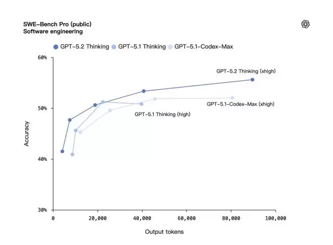 编码能力方面,GPT-5.2在SWE-Bench Pro(一项对现实世界软件工程进行的严格评估,测试四种语言,旨在更具抗污染性、挑战性、多样性和行业相关性)上,Thinking版取得了 55.6%的最高成绩,在SWE-bench Verified上,Thinking版取得了80%的高分。