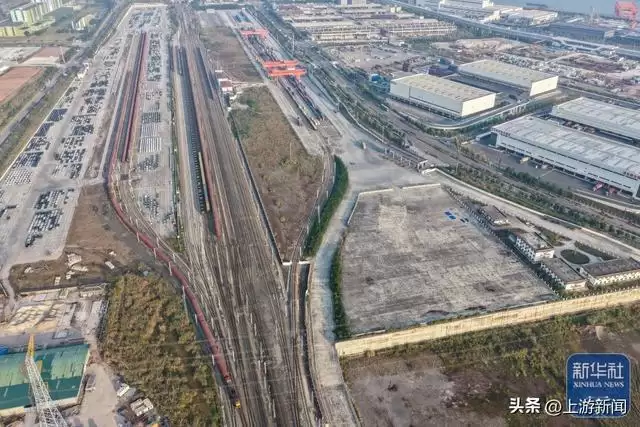 11月29日,在重庆果园港国家物流枢纽铁路货运鱼嘴站商品车物流基地,“重庆造”新能源汽车排队驶入“渝车”专列(无人机照片)。新华社记者 黄伟 摄