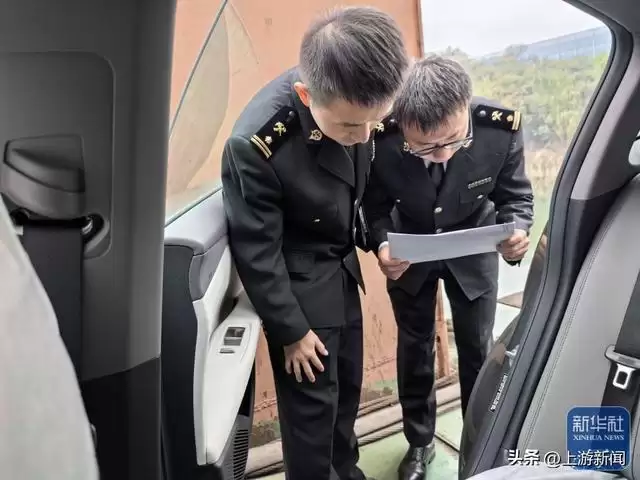 12月5日,在重庆果园港,重庆海关所属重庆港海关关员在核对出口新能源汽车铭牌。新华社发(罗智文 摄)