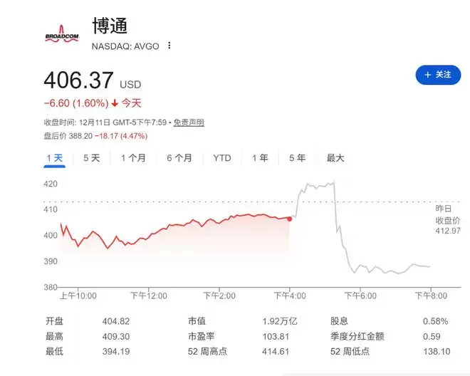 基于对AI收入预期的上调和对行业周期的更高能见度,高盛虽然维持了38倍的市盈率乘数不变,但将标准化每股收益(EPS)预估估值从11.50美元上调至12.00美元,从而得出450美元的新目标价。截至发稿,博通盘后下跌4.47%至406美元。