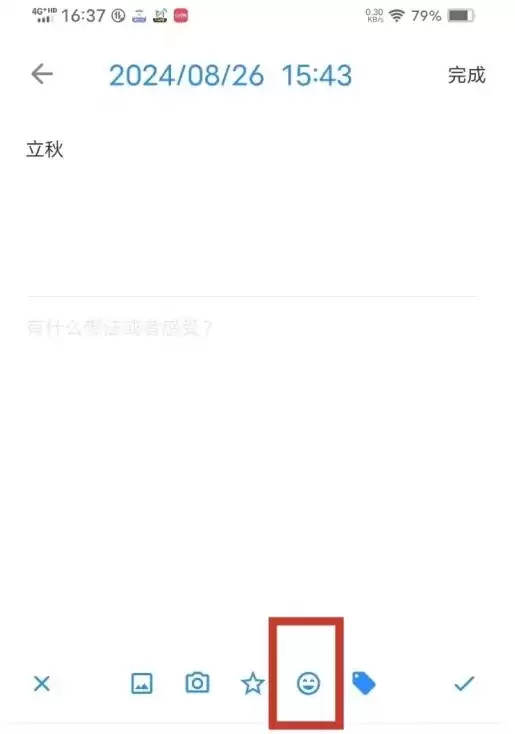 第二步:进入日记详情页面后,注意编辑区域上方的工具栏,点击那个笑脸形状的【心情图标】。