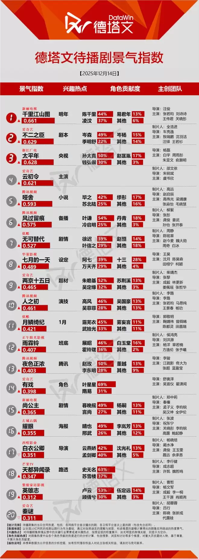 古装历史剧《太平年》近日网传将于跨年档播出,引发泛娱乐关注,带动剧集高位上榜。该剧聚焦影视创作鲜少涉猎的五代十国乱世与吴越文化,复现历史上的“纳土归宋”事件,传递“救民重于杀伐”的核心价值观,题材选择上具备一定的差异化竞争优势。在主创阵容上,导演杨磊与 编剧董哲的 联手,加之白宇、周雨彤、朱亚文等知名演员的加盟,进一步提振了市场对于剧集质感的期待值。然而,亦有部分舆论对历史正剧的商业表现持保留态度,担忧题 材过于沉重影响大众接受度。《太平年》由杨磊执导,白宇、周雨彤主演, 浙江广电、华策影视、金柯桥文化旅游集团 出品。