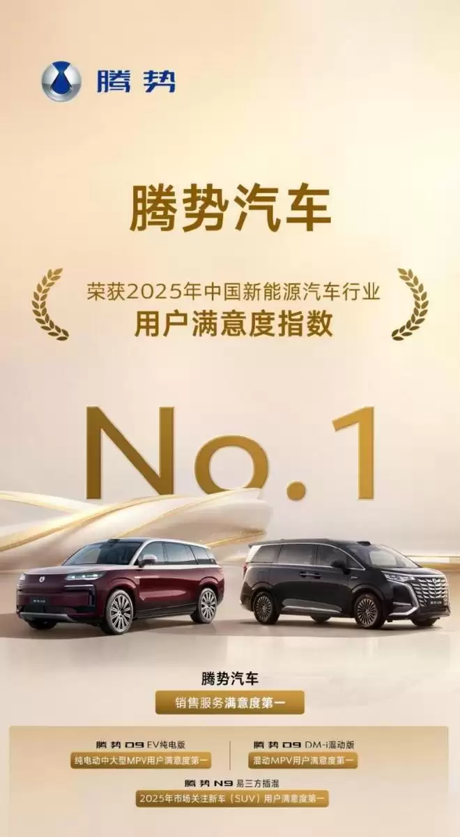 自2024年上市以来,腾势D9凭借宜商宜家的全能实力,连续两年蝉联中国MPV市场年度销量、保值率、用户满意度“三冠王”。今年1-11月,腾势D9再度夺魁,持续夯实其在中国MPV市场的冠军地位。近日,在中国质量协会权威发布的2025年中国新能源汽车行业用户满意度指数(NEV-CACSI)测评中,腾势D9 DM-i、腾势D9 EV分别获得混动MPV、纯电动中大MPV用户满意度第一名。