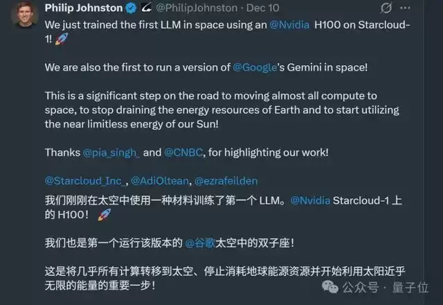 其联合创始人兼CEO激动表示,这是将几乎所有计算转移到太空、停止消耗地球能源资源并开始利用太阳近乎无限的能量的重要一步。