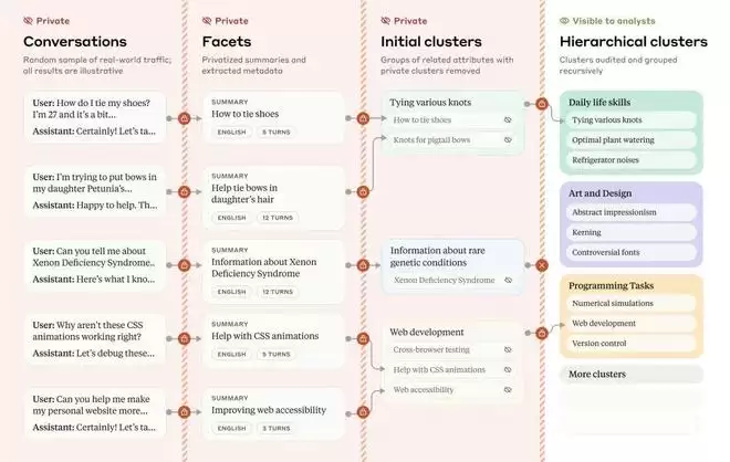 Anthropic的自动主题聚类工具Clio。用虚构的对话示例来说明Clio的分析步骤概述