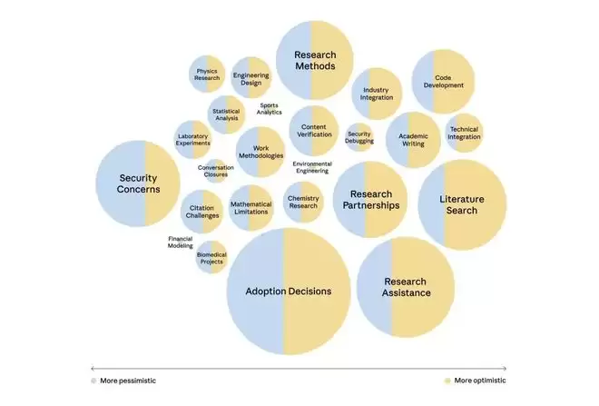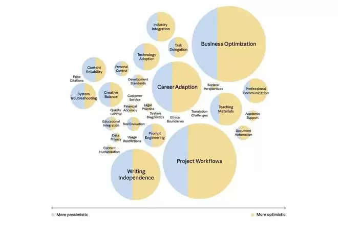 Anthropic将1250份访谈按主题聚类后,绘制的情绪倾向气泡图。蓝色越多代表越悲观,黄色越多代表越乐观,气泡越大代表该主题提及人数越多