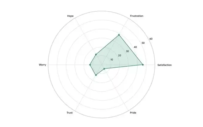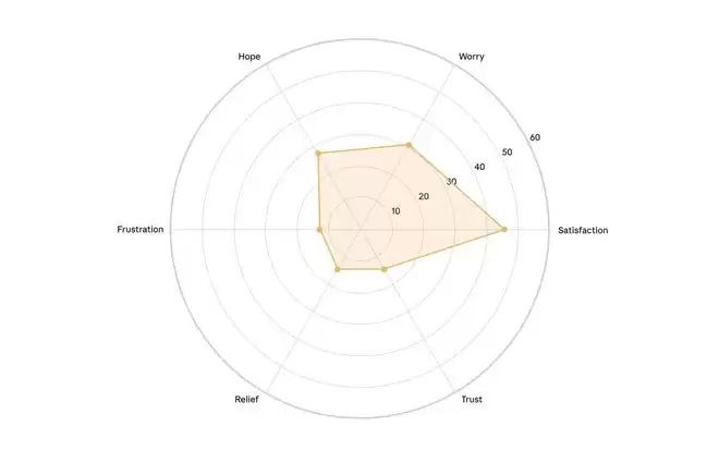 创作者样本的六维情绪雷达图。可以看到满意度很高,但信任和安全感较弱,担忧明显高于其他群体