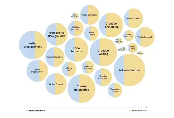 创作者样本的情绪主题可视化。蓝色越多代表越悲观,黄色越多代表越乐观,气泡越大代表该主题提及人数越多。来源:Anthropic创作者群体访谈分析