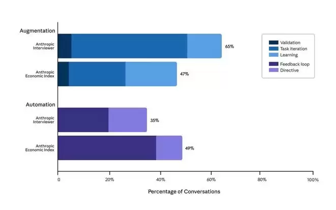 但Anthropic对Claude使用记录的分析显示,更大比例的使用其实是自动化——把任务直接交给模型完成,然后再自己稍作调整。
