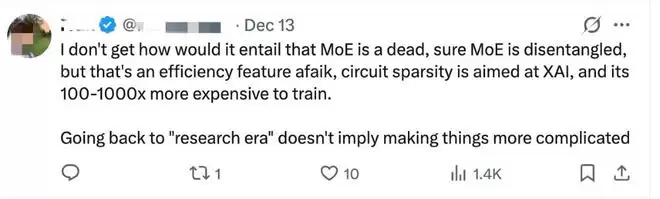 但有些网友却不这么认为,称其没有看出MoE模型为何会因此走到尽头,并进一步解释说这一技术是针对XAI(可解释AI)的,它的训练成本要高100-1000倍,回到“研究时代”并不意味着让事情变得更复杂。