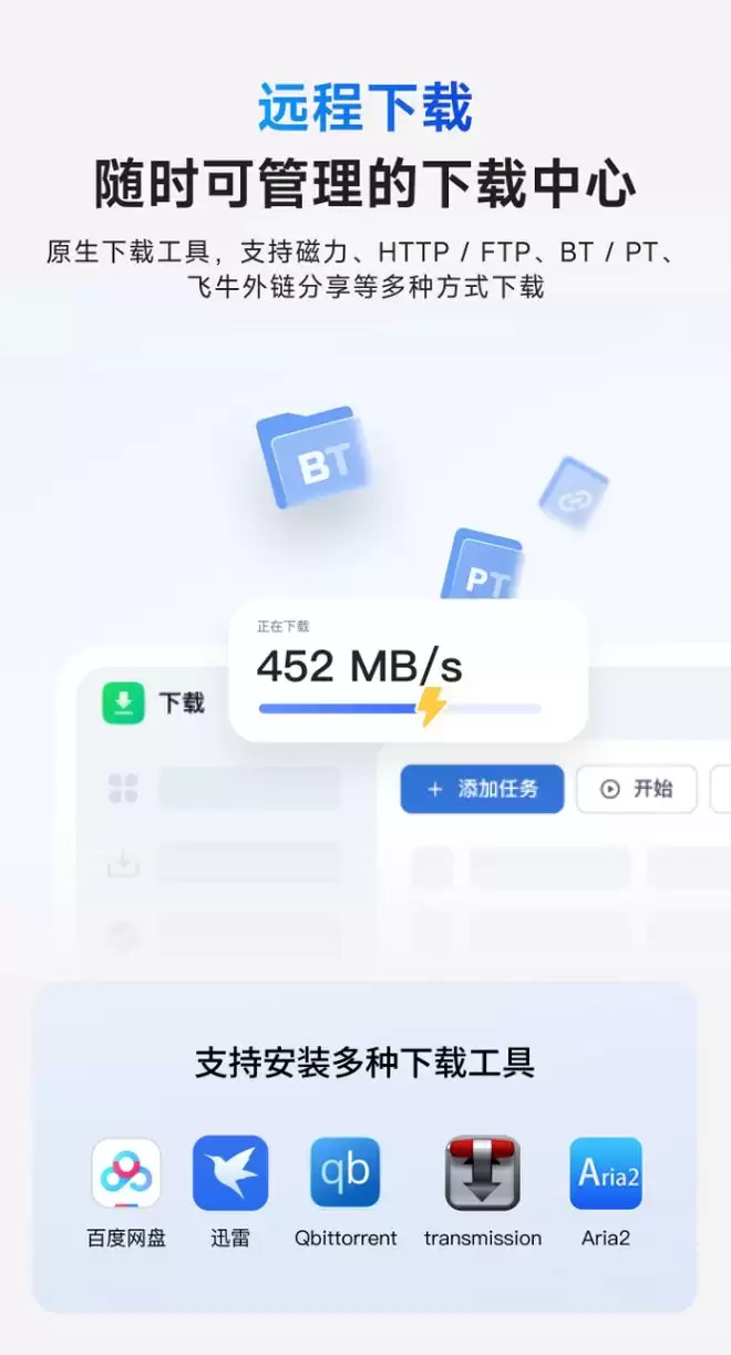特色功能方面,这款 NAS 支持本地 AI 相册、影视娱乐中心,可自动刮削影音文件,满足多端同步需求,还可以无缝同步 PC 与 Mac 的文件,支持安装百度网盘、迅雷、Aria 2、Qbittorrent 等下载工具,兼容 Docker 生态。