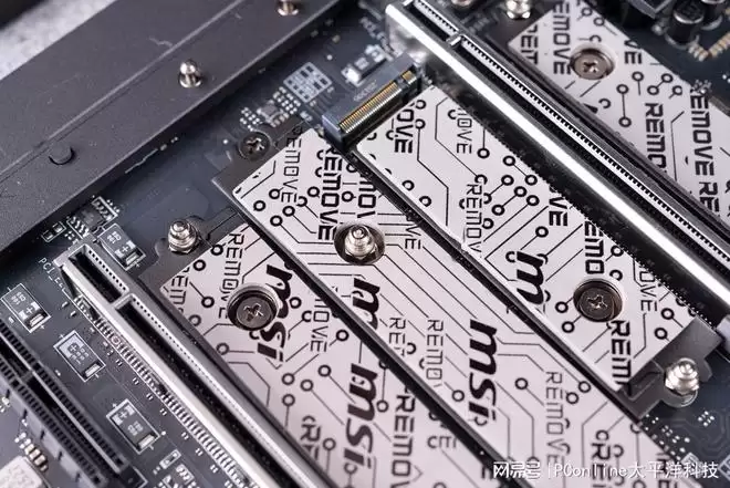 固态硬盘的安装也升级了快拆设计,微星称其为EZ M.2 Clip II 无螺丝安装设计,安装时直接把M.2固态硬盘对应好后,按上即可卡住,而拆卸仅需要向左轻轻一按即出来。