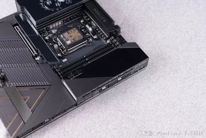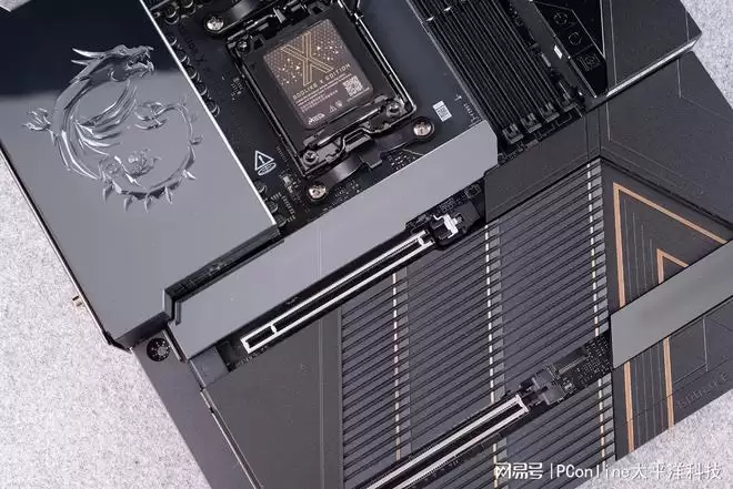 微星MEG X870E GODLIKE X EDITION超神的左侧装甲以及顶部散热装甲为一体式设计,并且外观上非常抢眼,不仅有经典的龙纹还有GODLIKE标识。