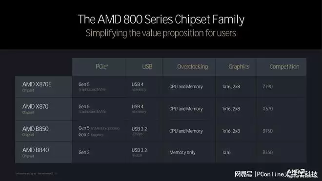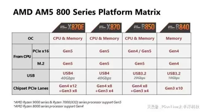 另外整个AMD 800系芯片组一共会有四款,分别是最顶级的X870E,X870以及定位主流的B850及全新的B840。不过最后这个B840更像上代的A620,其不支持CPU超频,仅支持内存超频,并且南桥芯片不提供PCIe 4.0,仅有8条PCIe 3.0,而且CPU提供的PCIe通道也只有4.0,没有USB 4接口。