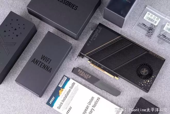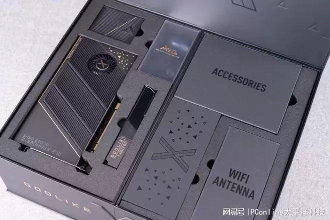 首先映入眼帘的正是微星MEG X870E GODLIKE X EDITION超神丰富的配件,除了有常规的PCIe 5.0速率的M.2扩展卡、一个EZ Control Hub集线盒、WiFi天线和若干连接线缆外,这次的GODLIKE X EDITION还额外给了定制纪念公仔、以及收藏展示底座。