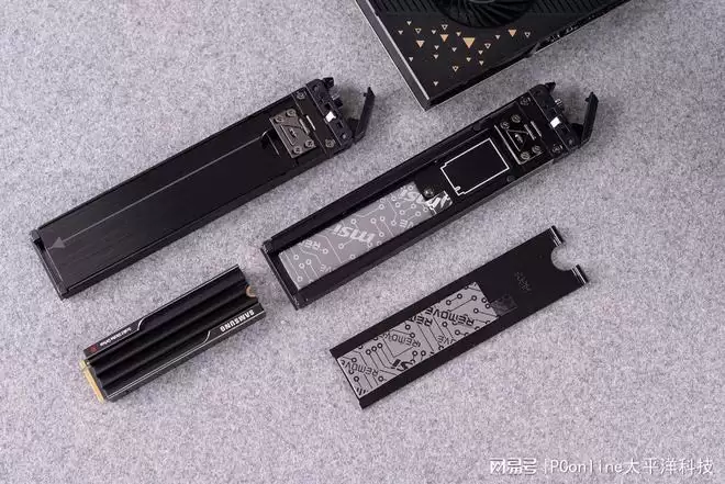 除此之外,其他的M.2插槽则配备了一整块的散热装甲,同时也安排了相同的快拆设计,并且所有的M.2插槽都配备了双面导热垫,因此无论是单面颗粒还是双面颗粒的SSD,都能得到很好的散热。
