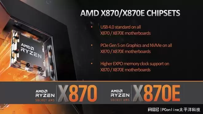 不过,新的X870E与X870主板将会标配USB4接口,传输速率将高达40 Gbps,桌面端也能享受到超高速的传输标准。另外,全新的X870E以及X870芯片组的主板还将进一步提升内存超频性能,带来更高的AMD EXPO内存超频选项预设,并且AMD给锐龙9000系处理器带来了OPP(Optimized Platform Profile)预设,据说内存性能能更进一步。