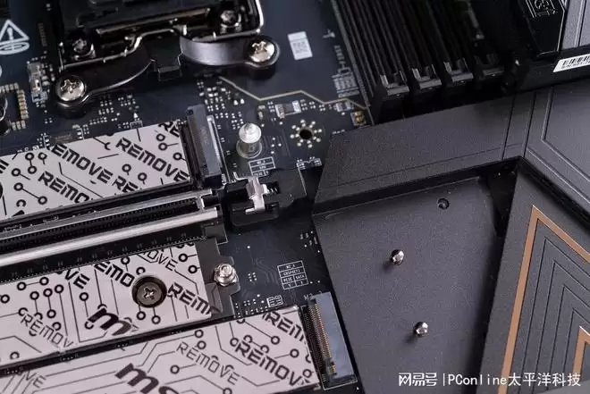 至于散热部分,所有的M.2插槽里,最顶部的拥有独立的散热装甲,前方有快拆设计,摁住弹片即可拆卸下来;同时尾部还有个磁吸接口,用来连通装甲上的ARGB灯。