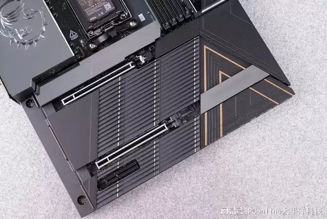 和很多主板一样,位于最上方的PCIe插槽自然是全速的PCIe 5.0×16插槽,而下面的则是PCIe 5.0×8插槽,均使用CPU直出的通道,两条插槽都使用了金属加固处理,有着更高的强度和耐用性。