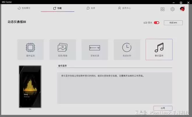 除此之外,MSI Center内的玩法也非常丰富,可以显示时间甚至是进行音乐律动展示。用户可以根据自己的喜好来选择显示的内容,完成设置后点击“应用”按钮,面板就会显示设置好的对应内容。